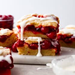 Enjoy cherry pie in its best form: cherry pie bars! You can whip up a whole pan in minutes using cherry pie filling. They’re beautiful, easy to make, and always a crowd-pleaser!