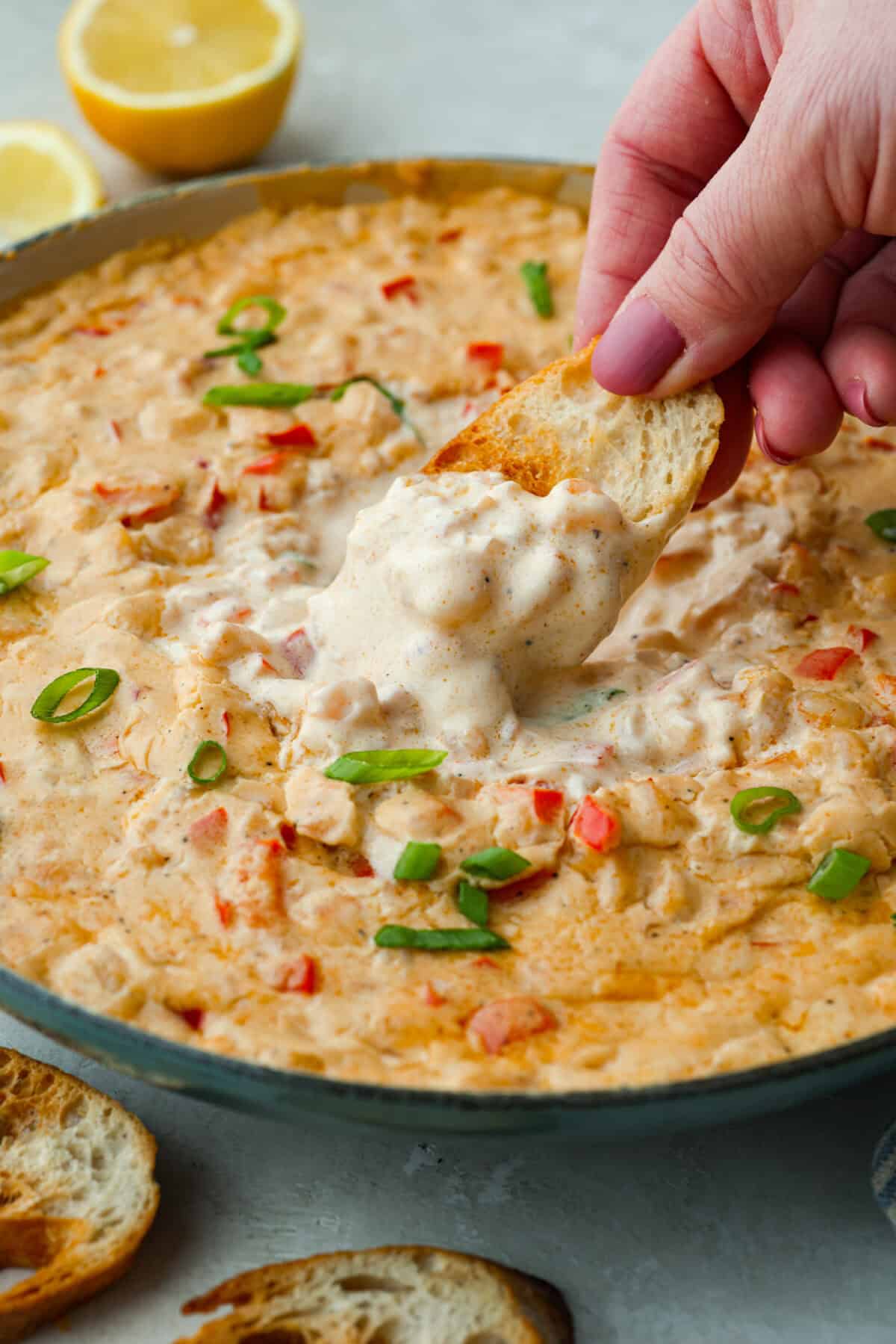 - Serve: Garnish with sliced green onions, then serve the Louisiana Shrimp Dip immediately.