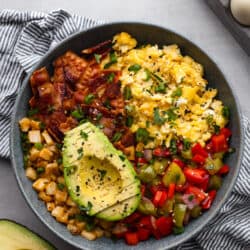 Start the day your way with this hearty Breakfast Bowl loaded with eggs, bacon, potatoes, and veggies.