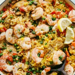 This chicken and shrimp paella is the perfect comfort food! Rich in flavor this paella is so delicious that you won’t be able to stop yourself from coming back for seconds!