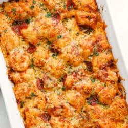 Bubble pizza is a fabulous spin on pepperoni pizza that is easy and crazy good! Soft pillowy biscuits are smothered in sauce, pepperoni, and topped with cheese!