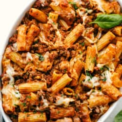 Baked Rigatoni is full of zesty meat, tender noodles and lots of cheese! Super simple and incredibly delicious, this is the ultimate comfort food!