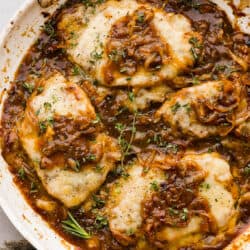 French Onion Pork Chops have all of the wonderful flavors of the classic soup in pork chop form! Caramelized onions and seared pork chops are joined with a savory sauce and two types of cheese for an amazing meal. Everything is cooked in one pan for a quick and easy weeknight dinner!