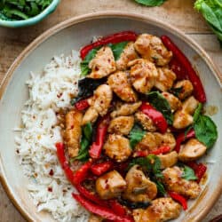 Thai Basil Chicken is a quick and easy chicken dinner that is bursting with fresh flavors. Bell peppers, fresh basil, and a unique blend of sauces make this chicken so crave-able!