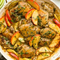 Juicy chicken thighs simmered in apple cider with crisp apples and warm spices. This cozy fall dinner is full of flavor.