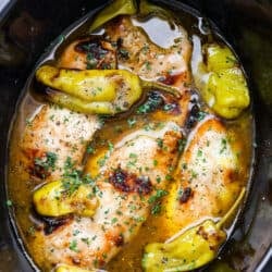 Crockpot Mississippi Chicken is all about fork-tender, juicy chicken that’s bursting with flavor. You’ve got zesty pepperoncini peppers, ranch seasoning, au jus mix, and butter that slow cooks with it for some seriously amazing flavor. It’s the perfect Southern comfort meal!